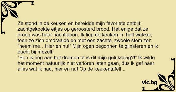 “Ben ik nog aan het dromen of is dit mijn geluksdag?!” Ik wilde het moment natuurlijk niet verloren laten gaan, dus ik gaf haar alles wat ik had, hier en nu! Op de keukentafel! Na een lange, heftige, uitputtende vrijpartij zei ze: