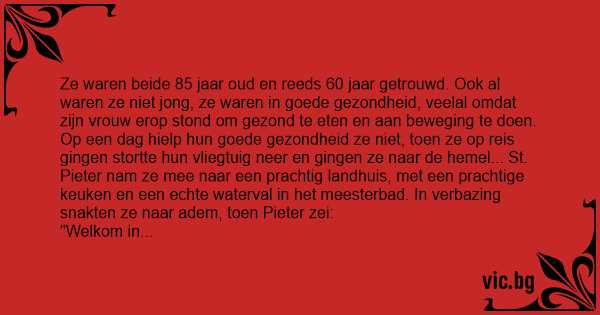 Ze waren beide 85 jaar oud en reeds 60 jaar getrouwd. Ook al waren ze niet jong, ze waren in goede gezondheid, veelal omdat zijn vrouw erop stond om gezond te eten en aan beweging te doen. Op een dag hielp hun goede gezondheid ze niet, toen ze op reis gingen stortte hun vliegtuig neer en gingen ze naar de hemel... St. Pieter nam ze mee naar een prachtig landhuis, met een prachtige keuken en een echte waterval in het meesterbad. In verbazing snakten ze naar adem, toen Pieter zei: