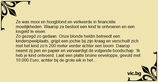 Zo gezegd zo gedaan. Onze blonde heldin betreedt een kinderspeelplaats, grijpt een jochie bij zijn kraag en verschuilt zich met het kind zon 200 meter verder achter een boom. Daarop neemt zij pen en papier en vervaardigt de volgende boodschap: Ik heb je kind ontvoerd. Laat een platte bruine enveloppe, gevuld met 10.000 Euro, achter bij de grote eik in het park. Morgen om 07.00 uur s avonds haal ik het geld op. Getekend: de blonde kidnapster.