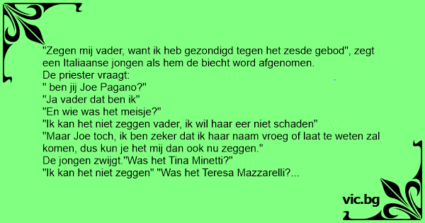 Ne man gaat biechten. "Eerwaarde," zegt hij, "ik heb gezondigd. Ik heb m'n vrouw bedrogen." Zegt de pastoor: "Toch niet met die blonde uit de Steegstraat?" "Nee." "Toch niet met die zwarte uit...