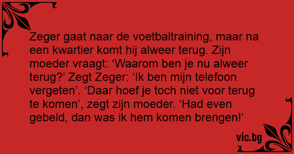 Zeger gaat naar de voetbaltraining, maar na een kwartier komt hij alweer terug. Zijn moeder vraagt: ‘Waarom ben je nu alweer terug?’ Zegt Zeger: ‘Ik ben mijn telefoon vergeten’. ‘Daar hoef je toch niet voor terug te komen’, zegt zijn moeder. ‘Had even gebeld, dan was ik hem komen brengen!’