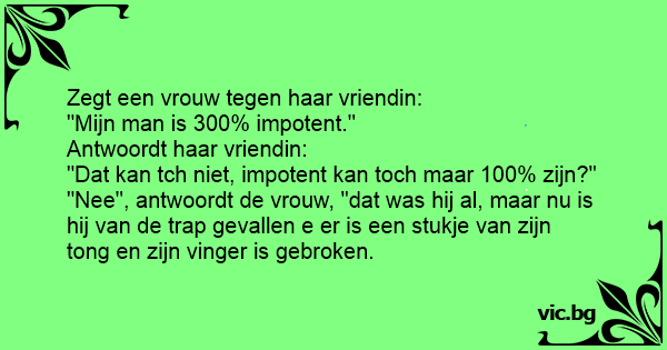 En kvinna berättar för sin väninna: - Min man är 300% impotent. - Va?! säger väninnan. Inte kan man väl vara 300% impotent? - Joo då.. igår var han bara 100% impotent men så ramlade han i morse,...