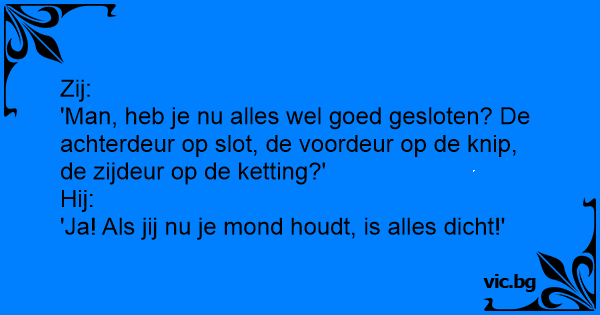 Zij:<br />'Man, heb je nu alles wel goed gesloten? De achterdeur op slot, de voordeur op de knip, de zijdeur op de ketting?'<br />Hij:<br />'Ja! Als jij nu je mond houdt, is alles dicht!'