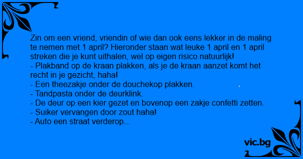 Zin om een vriend, vriendin of wie dan ook eens lekker in de maling te nemen met 1 april? Hieronder staan wat leuke 1 april en 1 april streken die je кunт uithalen, wel op eigen risico natuurlijk!