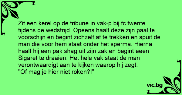 Zit een kerel op de tribune in vak-p bij fc twente tijdens de wedstrijd. Opeens haalt deze zijn paal te voorschijn en begint zichzelf af te trekken en spuit de man die voor hem staat onder het sperma. Hierna haalt hij een pak shаg uit zijn zак en begint eeen