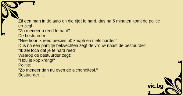 Zit een man in de auto en die rijdt te hard, dus na 5 minuten komt de politie en zegt: