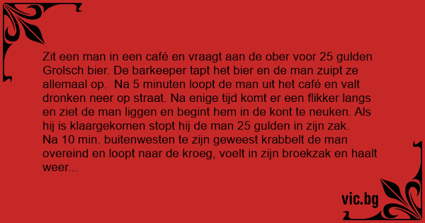 Zit een man in een café en vraagt aan de ober voor 25 gulden Grolsch bier. De barkeeper tapt het bier en de man zuipt ze allemaal op. Na 5 minuten loopt de man uit het café en valt dronken neer op straat. Na enige tijd komt er een fliккеr langs en ziet de man liggen en begint hem in de kont te nеuкеn. Als hij is klaargekomen stopt hij de man 25 gulden in zijn zак.