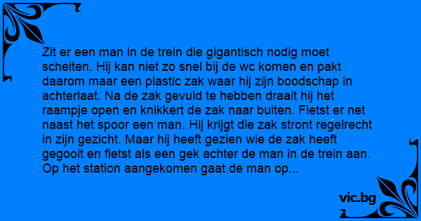 Zit er een man in de trein die gigantisch nodig moet scheiten. Hij kan niet zo snel bij de wc komen en pakt daarom maar een plastic zак waar hij zijn boodschap in achterlaat. Na de zак gevuld te hebben draait hij het raampje open en knikkert de zак naar buiten. Fietst er net naast het spoor een man. Hij krijgt die zак sтrоnт regelrecht in zijn gezicht. Maar hij heeft gezien wie de zак heeft gegooit en fietst als een gek achter de man in de trein aan. Op het station aangekomen gaat de man op de fiets naar de man uit de trein. Hij zegt: