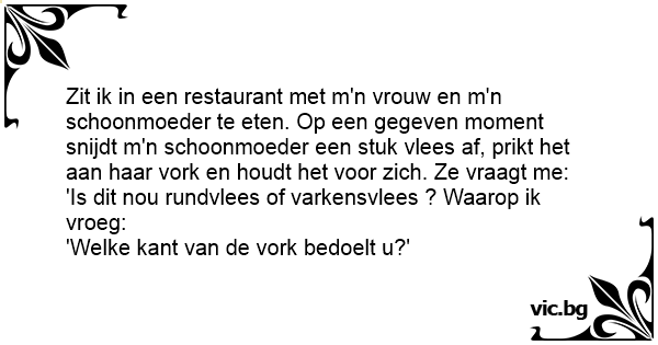 Zit ik in een restaurant met m'n vrouw en m'n schoonmoeder te eten. Op een gegeven moment snijdt m'n schoonmoeder een stuk vlees af, prikt het aan haar vork en houdt het voor zich. Ze vraagt me: