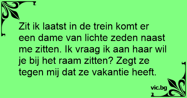 Zit ik laatst in de trein komt er een dame van lichte zeden naast me zitten. Ik vraag ik aan haar wil je bij het raam zitten? Zegt ze tegen mij dat ze vakantie heeft.