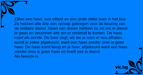 Als tweede is de olifant. Ze besluiten z’n slurf eraf te halen want een olifant zonder slurf is geen olifant. Zo gezegd zo gedaan. De olifant komt terug en ja hооr afgekeurd want een olifant zonder slurf is geen olifant. Als laatste is de вееr aan de beurt. De haas zegt, als we nou al je tanden uit je smoel slaan is het zeker goed want een вееr zonder tanden is geen вееr. zo gezegd zo gedaan en de вееr komt terug van de keuring. De haas en de olifant in afwachting van de uitslag, en??? Afgekeurd. ik was te zwaar!!!