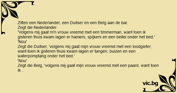 Zegt die Belg, 'volgens mij gaat mijn vrouw vreemd met een paard, want toen ik gisteren thuis kwam lag er een jockey onder het bed.'