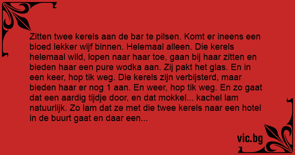 Zitten twee kerels aan de bar te pilsen. Komt er ineens een bloed lekker wijf binnen. Helemaal alleen. Die kerels helemaal wild, lopen naar haar toe, gaan bij haar zitten en bieden haar een pure wodka aan. Zij pakt het glas. En in een keer, hop tik weg. Die kerels zijn verbijsterd, maar bieden haar er nog 1 aan. En weer, hop tik weg. En zo gaat dat een aardig tijdje door, en dat mokkel... kachel lam natuurlijk. Zo lam dat ze met die twee kerels naar een hotel in de buurt gaat en daar een flink potje gaat liggen douwen.