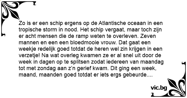 Zo is er een schip ergens op de Atlantische oceaan in een tropische storm in nood. Het schip vergaat, maar toch zijn er acht mensen die de ramp weten te overleven. Zeven mannen en een een bloedmooie vrouw. Dat gaat een weekje redelijk goed totdat de heren wel zin krijgen in een verzetje! Na wat overleg kwamen ze er al snel uit door de week in dagen op te splitsen zodat iedereen van maandag tot met zondag aan z’n gerief kwam. Dit ging een week, maand, maanden goed totdat er iets ergs gebeurde. De mooie dame kwam te overlijden… Nou dat was wat…. Het ging een dag goed, twee dagen ging ook nog wel, drie dagen ging al wat moeilijker. Na een week hebben ze toch maar besloten om haar te begraven…