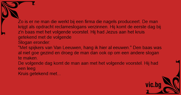 Zo is er ne man die werkt bij een firma die nagels produceert. De man krijgt als opdracht reclameslogans verzinnen. Hij komt de eerste dag bij z'n baas met het volgende voorstel. Hij had Jezus aan het kruis getekend met de volgende