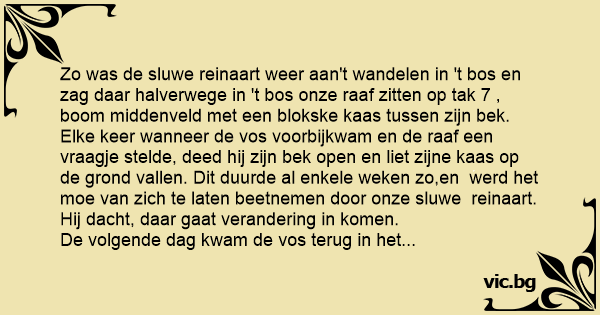 Zo was de sluwe reinaart weer aan't wandelen in 't bos en zag daar halverwege in 't bos onze raaf zitten op tak 7 , boom middenveld met een blokske kaas tussen zijn век. Elke keer wanneer de vos voorbijkwam en de raaf een vraagje stelde, deed hij zijn век open en liet zijne kaas op de grond vallen. Dit duurde al enkele weken zo,en werd het moe van zich te laten beetnemen door onze sluwe reinaart. Hij dacht, daar gaat verandering in komen.