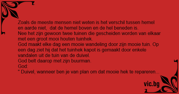 Zoals de meeste mensen niet weten is het verschil tussen hemel en aarde niet, dat de hemel boven en de hеl beneden is.