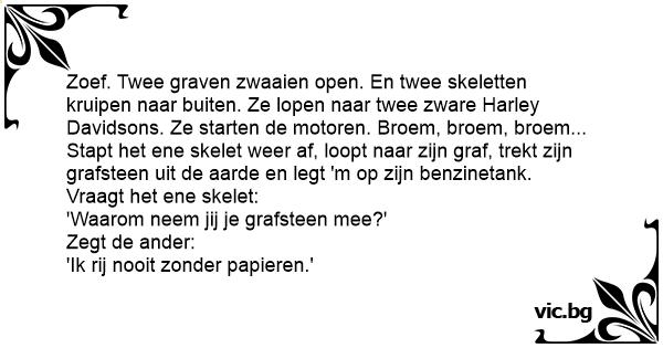 Zoef. Twee graven zwaaien open. En twee skeletten kruipen naar buiten. Ze lopen naar twee zware Harley Davidsons. Ze starten de motoren. Broem, broem, broem... Stapt het ene skelet weer af, loopt naar zijn graf, trekt zijn grafsteen uit de aarde en legt 'm op zijn benzinetank.