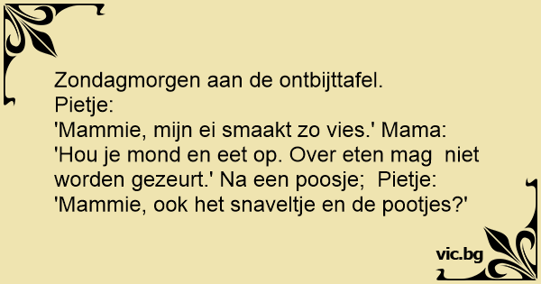 'Hou je mond en eet op. Over eten mag niet worden gezeurt.' Na een poosje; Pietje: