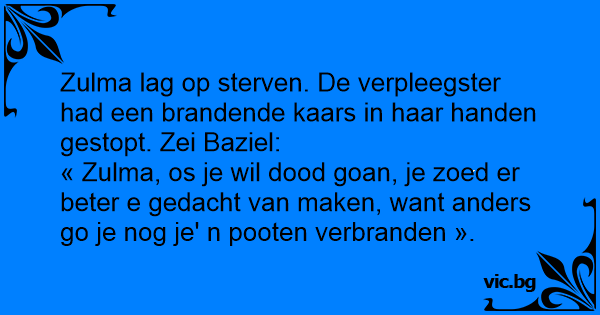 « Zulma, os je wil dood goan, je zoed er beter e gedacht van maken, want anders go je nog je' n pooten verbranden ».