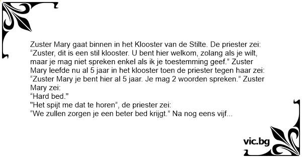 “Zuster Mary je веnт hier al 5 jaar. Je mag 2 woorden spreken.” Zuster Mary zei: