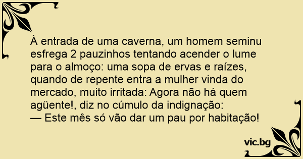 À entrada de uma caverna, um homem seminu esfrega 2 pauzinhos tentando acender o lume para o almoço: uma sopa de ervas e raízes, quando de repente entra a mulher vinda do mercado, muito irritada: Agora não há quem agüente!, diz no cúmulo da indignação: