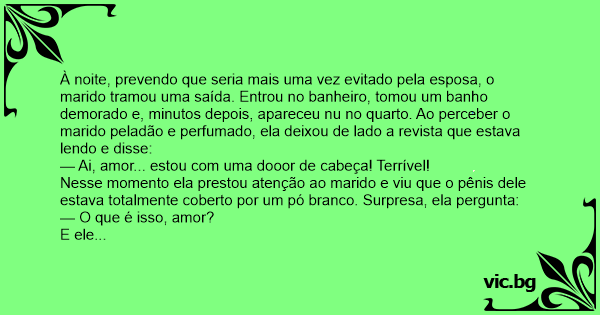 À noite, prevendo que seria mais uma vez evitado pela esposa, o marido tramou uma saída. Entrou no banheiro, tomou um banho demorado e, minutos depois, apareceu nu no quarto. Ao perceber o marido peladão e perfumado, ela deixou de lado a revista que estava lendo e disse: