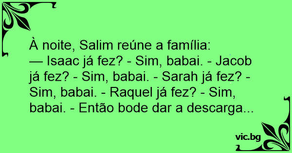 — Isaac já fez? - Sim, babai. - Jacob já fez? - Sim, babai. - Sarah já fez? - Sim, babai. - Raquel já fez? - Sim, babai. - Então bode dar a descarga...