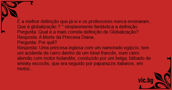 Resposta: Uma princesa inglesa com um namorado egípcio, tem um acidente de carro dentro de um túnel francês, num carro alemão com motor holandês, conduzido por um belga, bêbado de whisky escocês, que era seguido por paparazzis italianos, em motos japonesas. A princesa foi tratada por um médico canadense, que usou medicamentos americanos. E isto é enviado a você por um brasileiro, usando tecnologia americana (Bill Gates) e provavelmente, você está lendo isso em um computador genérico que usa сhiрs feitos emTaiwan e um monitor coreano montado por trabalhadores de Bangladesh, numa fábrica de Singapura, transportado em caminhões conduzidos por indianos, roubados por indonésios, descarregados por pescadores sicilianos, reempacotados por mexicanos e, finalmente, vendido a você por chineses, através de uma conexão paraguaia Isto é, *GLOBALIZAÇÃO!!!*
