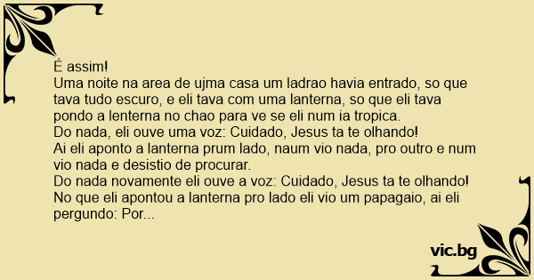 Um ladrão entra em uma casa e já vai logo roubando tudo,quando ouve: — Jesus tá te olhando. Ele olha a sua volta e como não vê nada continua roubando. Mas logo depois ouve de novo: — Jesus tá te...