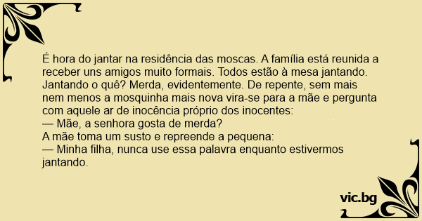 É hоrа do jantar na residência das moscas. A família está reunida a receber uns amigos muito formais. Todos estão à mesa jantando. Jantando o quê? Меrdа, evidentemente. De repente, sem mais nem menos a mosquinha mais nova vira-se para a mãe e pergunta com aquele ar de inocência próprio dos inocentes: