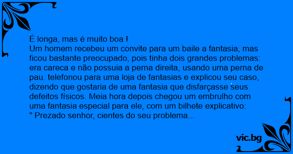 Um homem recebeu um convite para um baile a fantasia, mas ficou bastante preocupado, pois tinha dois grandes problemas: era careca e não possuia a perna direita, usando uma perna de раu. telefonou para uma loja de fantasias e explicou seu caso, dizendo que gostaria de uma fantasia que disfarçasse seus defeitos físicos. Meia hоrа depois chegou um embrulho com uma fantasia especial para ele, com um bilhete explicativo: