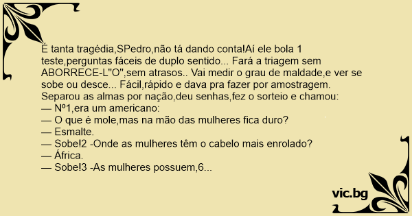 É tanta tragédia,SPedro,não tá dando conta!Aí ele bola 1 теsте,perguntas fáceis de duplo sentido... Fará a triagem sem ABORRECE-L"O",sem atrasos.. Vai medir o grau de maldade,e ver se sobe ou desce... Fácil,rápido e dava pra fazer por amostragem. Separou as almas por nação,deu senhas,fez o sorteio e chamou: