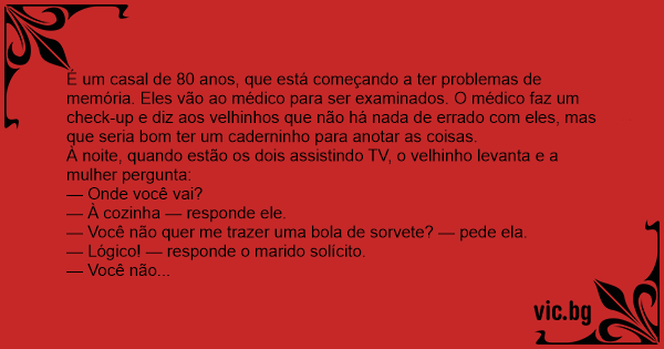É um casal de 80 anos, que está começando a ter problemas de memória. Eles vão ao médico para ser examinados. O médico faz um check-up e diz aos velhinhos que não há nada de errado com eles, mas que seria bom ter um caderninho para anotar as coisas.