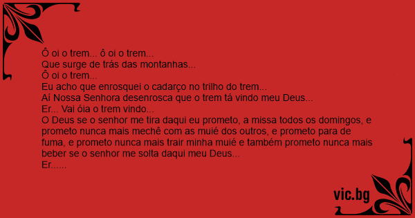 O Deus se o senhor me tira daqui eu prometo, a missa todos os domingos, e prometo nunca mais mechê com as muié dos outros, e prometo para de fuma, e prometo nunca mais trair minha muié e também prometo nunca mais beber se o senhor me solta daqui meu Deus...