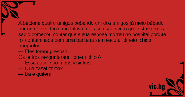A bacteria quatro amigos bebendo um dos amigos já meio bêbado por nome de chico não falava mais só escutava o que estava mais sadio comecou contar que a sua esposa morreu no hospital porque foi contaminada com uma bacteria sem escutar direito, chico perguntou: