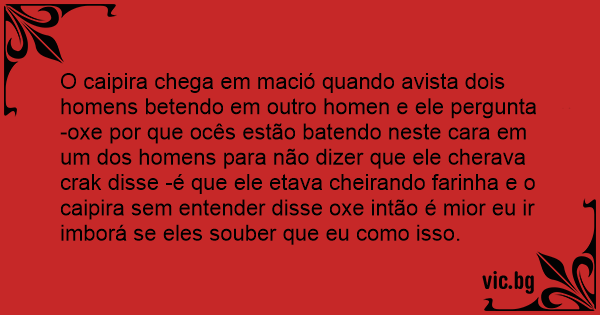 O caipira chega em mació quando avista dois homens betendo em outro homen e ele pergunta -oxe por que ocês estão batendo neste cara em um dos homens para não dizer que ele cherava crak disse -é que ele etava cheirando farinha e o caipira sem entender disse oxe intão é mior eu ir imborá se eles souber que eu como isso.