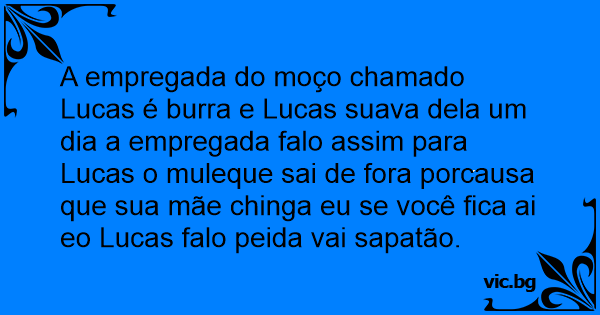 A empregada do moço chamado Lucas é burra e Lucas suava dela um dia a empregada falo assim para Lucas o muleque sai de fora porcausa que sua mãe chinga eu se você fiса ai eo Lucas falo peida vai sapatão.