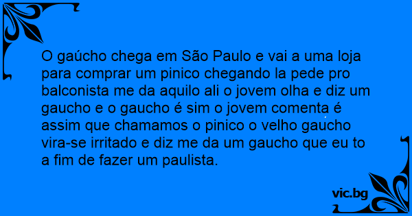 O gaúcho chega em São Paulo e vai a uma loja para comprar um pinico chegando la pede pro balconista me da aquilo ali o jovem olha e diz um gaucho e o gaucho é sim o jovem comenta é assim que chamamos o pinico o velho gaucho vira-se irritado e diz me da um gaucho que eu to a fim de fazer um paulista.