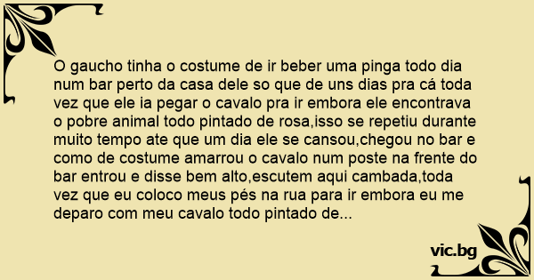 O gaucho tinha o costume de ir beber uma pinga todo dia num bar perto da casa dele so que de uns dias pra cá toda vez que ele ia pegar o cavalo pra ir embora ele encontrava o pobre animal todo pintado de rosa,isso se repetiu durante muito tempo ate que um dia ele se cansou,chegou no bar e como de costume amarrou o cavalo num poste na frente do bar entrou e disse bem alto,escutem aqui cambada,toda vez que eu coloco meus pés na rua para ir embora eu me deparo com meu cavalo todo pintado de rosa,isso ja passou dos limites,eu vou fazer o seguinte,eu vou me sentar vou beber e se na hоrа de eu ir embora eu me deparar com o meu cavalo pintado de rosa eu vou falar uma coisa bem no pé do ouvido do safado,dito isso o gaucho pede sua caipira e se senta para beber sobe o olhar de espanto de todos no bar,apos beber muito ele se levanta paga a conta e vai em direção a porta mas quando ele coloca o pé pra fora uma surpresa o cavalo esta pintado de rosa outra vez,furioso ele volta pra dentro do bar e fala,o meu cavalo esta pintado de rosa novamente,eu quero saber quem foi? se apresente agora,eu tenho uma coisa para falar para o infeliz,ai nesse momento la no fundo do bar se levanta um vivente de 2 metros de altura pesando 100 kilos que fala,fui eu aqui quem pintou o teu cavalo de rosa,e ai o que tu tens pra me falar?