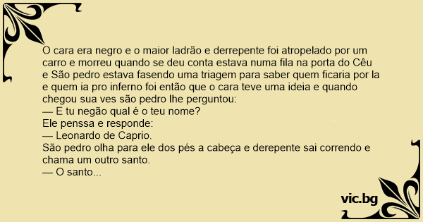 Uma vez um negão morreu e foi pro céu chegando lá bateu na porta São Pedro, o atendeu e perguntou: — Quem é? E ele respondeu: — Leonardo di Caprio. São Pedro disse: — Espere um minutinho só! E em...