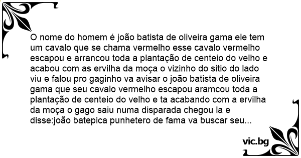 O nome do homem é joão batista de oliveira gama ele tem um cavalo que se chama vermelho esse cavalo vermelho escapou e arrancou toda a plantação de centeio do velho e acabou com as ervilha da moça o vizinho do sitio do lado viu e falou pro gaginho va avisar o joão batista de oliveira gama que seu cavalo vermelho escapou aramcou toda a plantação de centeio do velho e ta acabando com a ervilha da moça o gago saiu numa disparada chegou la e disse:joão batepica punhetero de fama va buscar seu caraio vermelho que arancou tudo os pentio do velho e ta acabando com a virilha da moça .