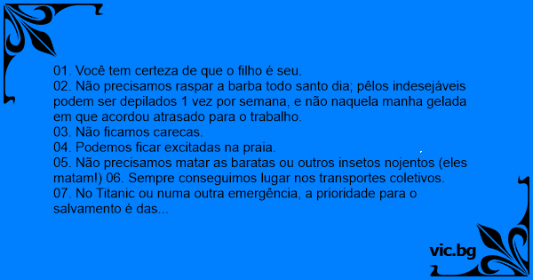 05. Não precisamos matar as baratas ou outros insetos nojentos (eles matam!) 06. Sempre conseguimos lugar nos transportes coletivos.