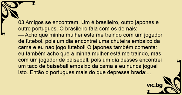 — Acho que minha mulher está me traindo com um jogador de futebol, pois um dia encontrei uma chuteira embaixo da cama e eu nao jogo futebol! O japones também comenta: eu também acho que a minha mulher está me traindo, mas com um jogador de baiseball, pois um dia desses encontrei um taco de baiseball embaixo da cama e eu nunca joguei isto. Então o portugues mais do que depressa brada: pois eu acho que minha mulher está a me trair com um cavalo, pois encontrei um jóquei embaixo de minha cama e eu nunca andei de cavalo!!!!!