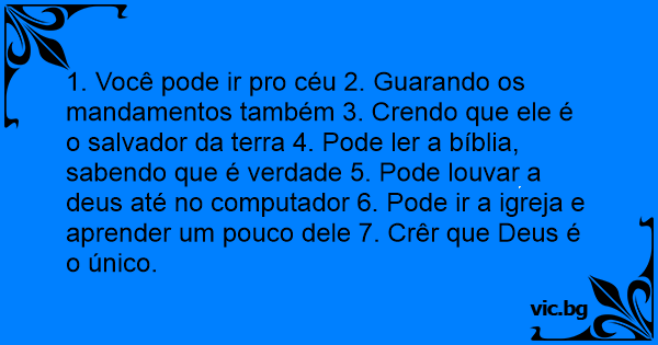 1. Você pode ir pro céu 2. Guarando os mandamentos também 3. Crendo que ele é o salvador da terra 4. Pode ler a bíblia, sabendo que é verdade 5. Pode louvar a deus até no computador 6. Pode ir a igreja e aprender um pouco dele 7. Crêr que Deus é o único.