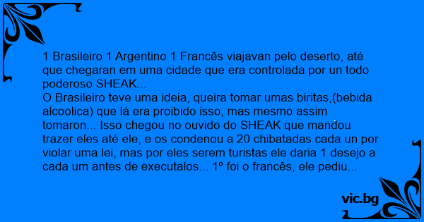 O Brasileiro teve uma ideia, queira tomar umas biritas,(bebida alcoolica) que lá era proibido isso, mas mesmo assim tomaron... Isso chegou no ouvido do SHEAK que mandou trazer eles até ele, e os condenou a 20 chibatadas cada un por violar uma lei, mas por eles serem turistas ele daria 1 desejo a cada um antes de executalos... 1º foi o francês, ele pediu que amarrasem 2 ravesseiros en suas costas, mas foi en vão os travesseiros aguentaron apenas 10 chibatadas e as outras 10 sangraran muito as costas dele... vendo isso o argentino pediu que colocasem 4 travesseiros en suas costas, os travesseiros aguentaron 15 chibatadas e ele tb saiu sangrando... chegando a vez do brasileiro o SHEAK interompe a pedido de sua Esposa, ele diz ao brasileiro... Por minha mulher gostar muito do Barsil eu te darei o direito de 2 desejos... O Brasileiro disse, isso tudo foi culpa minha por isso meu primeiro desejo será que envez de 20 chibataas eu quero 100 chibatadas... OOOOO o Sheak o Admiro e disse apesar de sua sinceridade era muito valente tambem... ai o Sheak pergunta que seria o 2º desejo ... o brasileiro responde ... amarrem o argentino nas minhas costas....