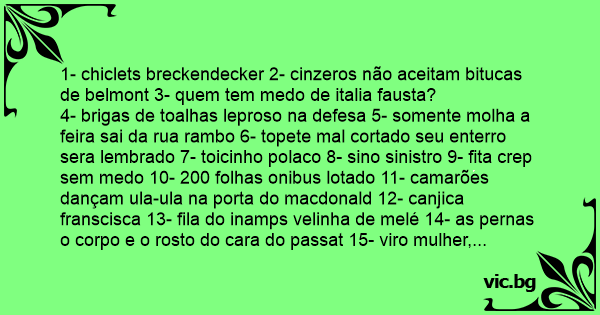 4- brigas de toalhas leproso na defesa 5- somente molha a feira sai da rua rambo 6- topete mal cortado seu enterro sera lembrado 7- toicinho polaco 8- sino sinistro 9- fita crep sem medo 10- 200 folhas onibus lotado 11- camarões dançam ula-ula na porta do macdonald 12- canjica franscisca 13- fila do inamps velinha de melé 14- as pernas o corpo e o rosto do cara do passat 15- viro mulher, viro homem, e viro homem, não viro mulher essas foram as piadinhas malacubako, para mais delas brevemente estaremos com o site www. Troxchas. Com. Br, enquanto isso nos envie um e-mail para: [email protected]