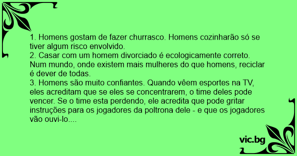 1. Homens gostam de fazer churrasco. Homens cozinharão só se tiver algum risco envolvido.