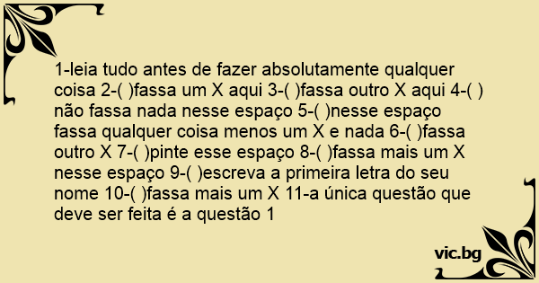 1-leia tudo antes de fazer absolutamente qualquer coisa 2-( )fassa um X aqui 3-( )fassa outro X aqui 4-( )não fassa nada nesse espaço 5-( )nesse espaço fassa qualquer coisa menos um X e nada 6-( )fassa outro X 7-( )pinte esse espaço 8-( )fassa mais um X nesse espaço 9-( )escreva a primeira letra do seu nome 10-( )fassa mais um X 11-a única questão que deve ser feita é a questão 1