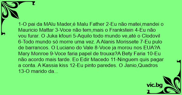 1-O pai da MAlu Mader,é Malu Father 2-Eu não matei,mandei o Mauricio Mattar 3-Voce não tem,mais o Frankstein 4-Eu não vou furar. O Juka kfouri 5-Aquilo todo mundo ve,até o Clodovil 6-Todo mundo só morre uma vez. A Alanis Morissete 7-Eu pulo de barrancos. O Luciano do Vale 8-Voce ja morou nos EUA?A Mary Monroe 9-Voce faria papel de тrоuxа?A Bety Faria 10-Eu não acordo mais tarde. Eo Edir Macedo 11-Ninguem quis pagar a conta. A Kassia kiss 12-Eu pinto paredes. O Janio,Quadros 13-O marido da Hilda Furacão é Tony Tornado 14-O Pateta usa o teclado. E o Mikey Mouse 15-Eu escovo os dentes 4x ao dia. Eo Joãozinho Trinta 16-Voce ja esteve na Europa?A Adriana Esteves 17-Eu fumo. E o Celso Pitta 18-Eu gosto de chá gelado. E o Clark Kent 19-Eu fujo. O Chiquinho Scarpa 20-Voce riu dessas piadas?O Damon Hill